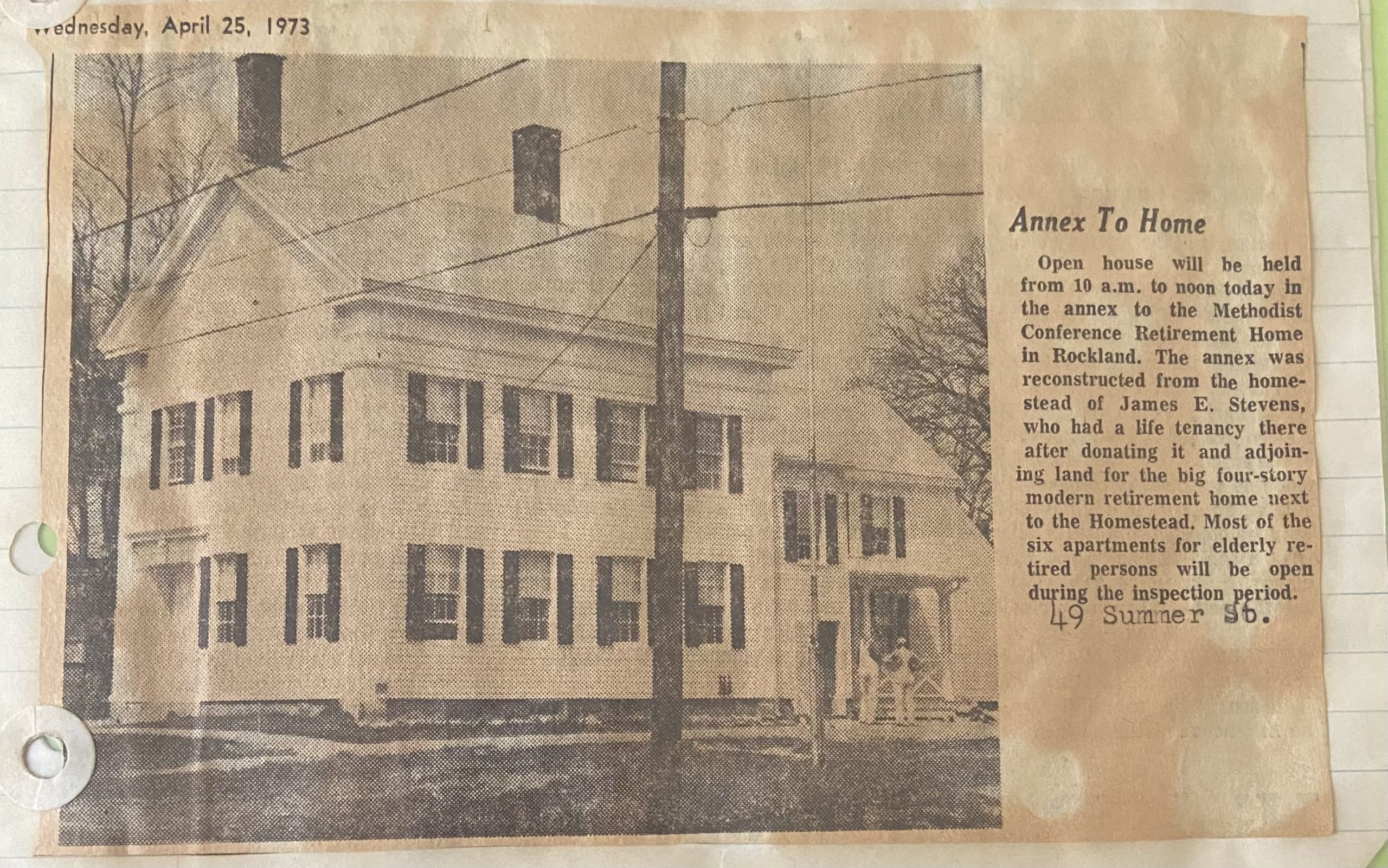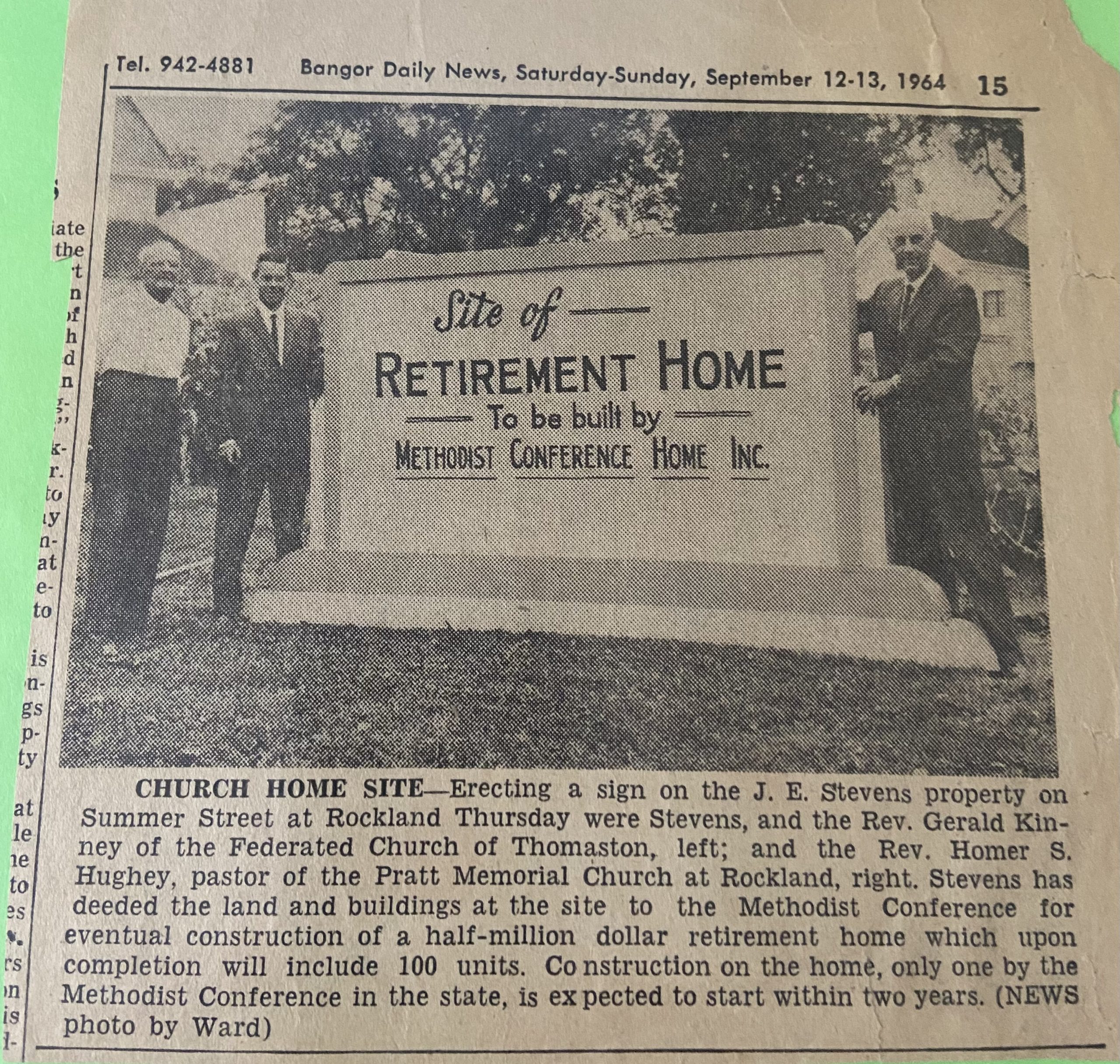 Methodist Conference Home (MCH) is established in Rockland. Construction begins on Summer Street to provide housing and services to assist all elderly persons with limited incomes to remain independent.