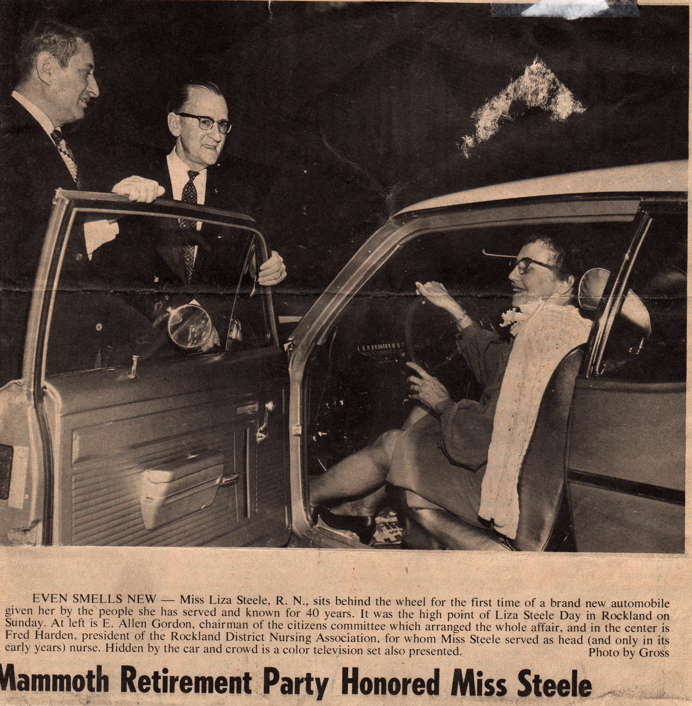 Rockland District Nursing Association founding nurse Eliza Steele officially retires. Her extraordinary 40-year commitment was recognized during a “Mammoth Retirement Party,” capped by the naming of a city street in her honor. She also received numerous gifts, including a new car and television set.